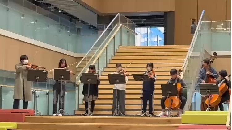 校舎設計時には、校舎中央の大階段をコンサートの舞台として使うアイデアはありませんでしたが、開校後、生徒達が自然と舞台として使うようになり、今に至ります。音楽のある学校を創ってくれている弦楽アンサンブル部に感謝します。
